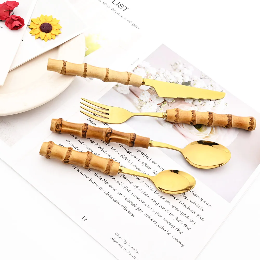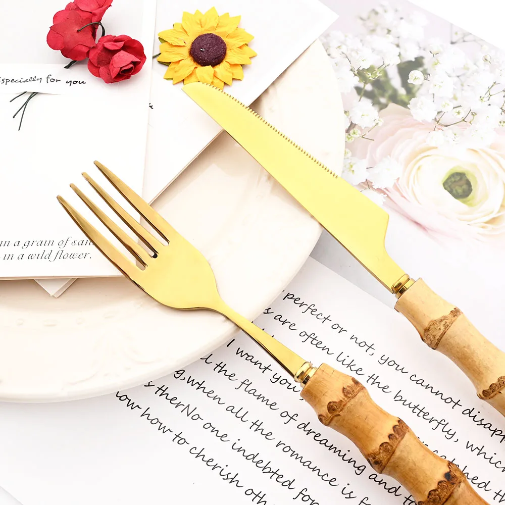 Drmfiy Gold Dinner Fork Cutlery Set Stainless Steel 4/6/10Pcs Fork Dinnerware Set Kitchen Western Bamboo Handle Tableware Set